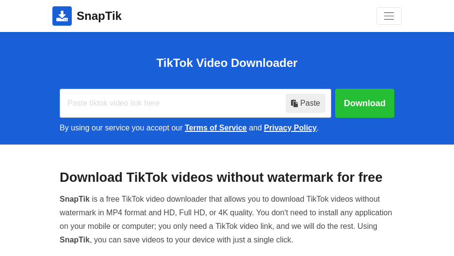 - Snaptik is a free tool used to download TikTok videos without the official watermark.